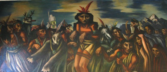 Censored or not, the WPA post office mural contest greatly contributed to the distinction of American Mural Art, now recognized as an important and well preserved aspect of 20th century cultural history. In a time of extreme economic hardship and global strife (not unlike the present), the United States government embraced the arts as an integral part of our cultural identity, not for the elite but for everyman in everyday public places. It acknowledged artistic practice as a vocation by including it in the WPA funding. Some municipalities today still have “Percent for Art” projects where a percentage of the funds for new public buildings are allocated for the arts, and the work is usually decided on by a design competition. When budgets are cut, these funds are the first to go. What do we lose when we lose our culture—when we don’t recognize its value and ensure its continued relevance and preservation—when we let it go because there’s no room and no money—when we prioritize progress and profit instead? We lose our way of life–the many different ways of life that make up our rich American culture–like the Native American chief dancing out of the way of the locomotive. And eventually we get the censoring of the image of that loss, so no one will think about what was lost anymore, and we are left instead with a nostalgia for something we don’t even really know or understand anymore. Is this the American plight?